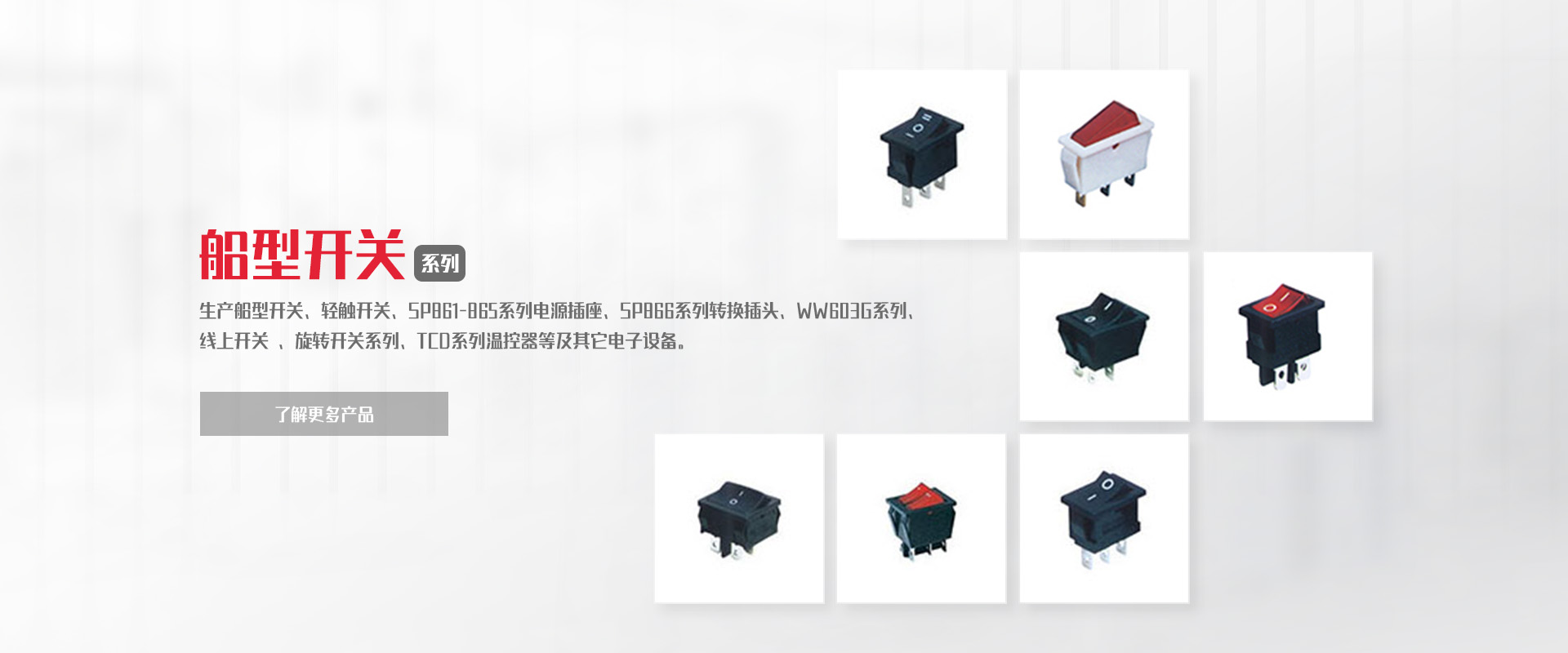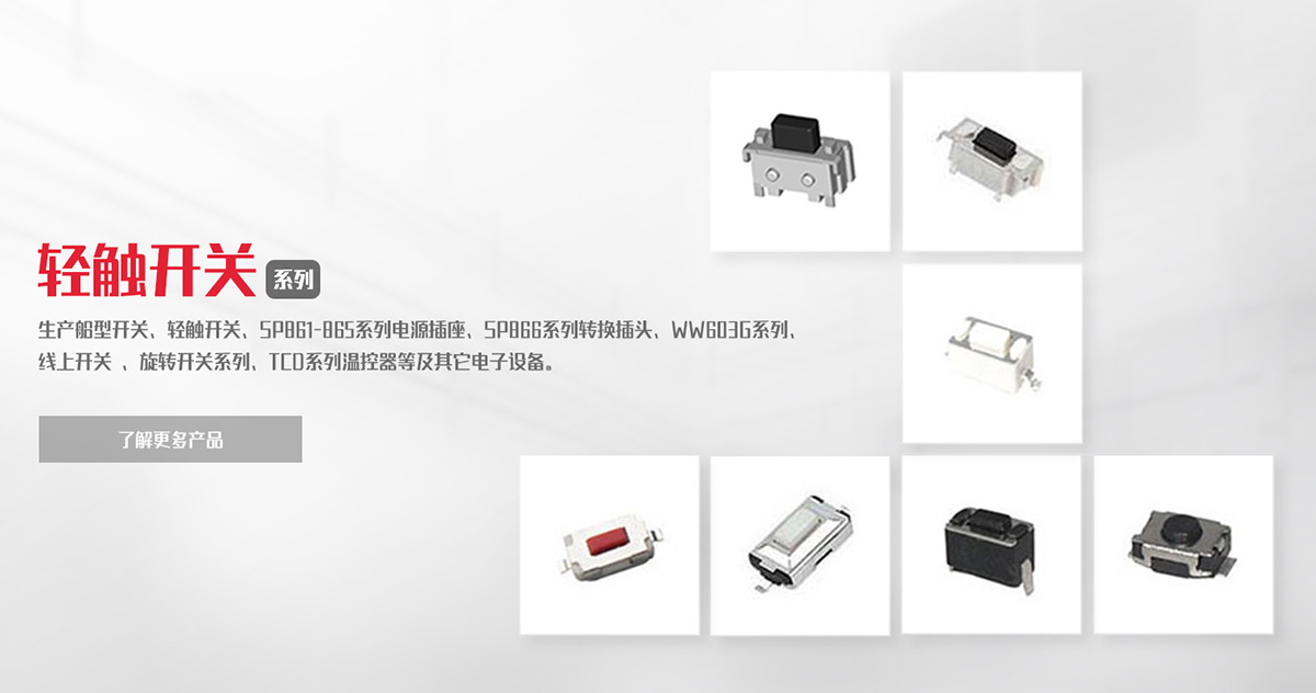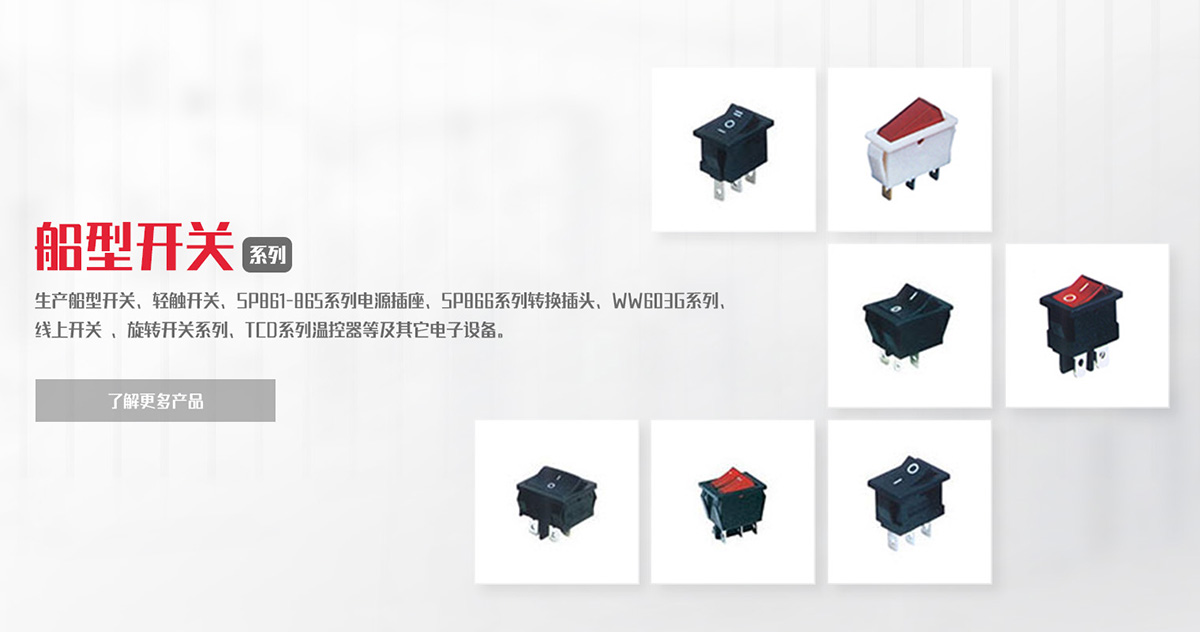致力于船型開關(guān)、負(fù)載開關(guān)、輕觸開關(guān)、微動(dòng)開關(guān)等產(chǎn)品的研發(fā)、制造、銷售。
