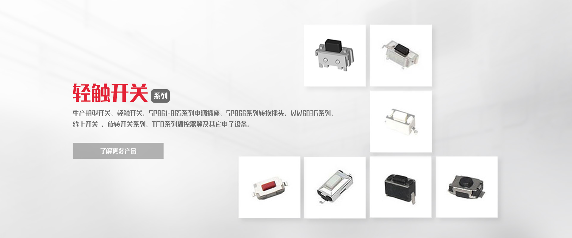 公司專業(yè)生產(chǎn)船型開關(guān)、輕觸開關(guān)、SP861-865系列電源插座、SP866系列轉(zhuǎn)換插頭、WW11系列微動(dòng)開關(guān)、WW01-03、09系列按鈕開關(guān)DS、WW系列指示燈開關(guān)、WW603G系列 線上開關(guān) 、旋轉(zhuǎn)開關(guān)系列、TCD系列溫控器等及其它電子設(shè)備。